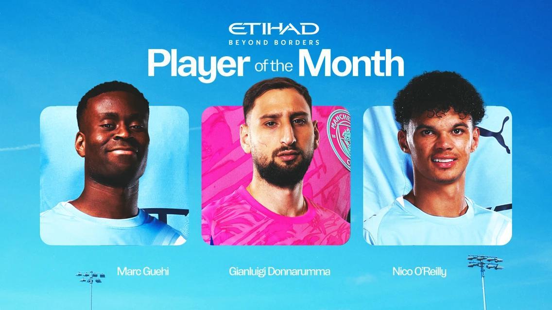 曼城官方公布了队内2月最佳球员候选名单,分别是格伊、多纳鲁马和尼科-奥赖利。